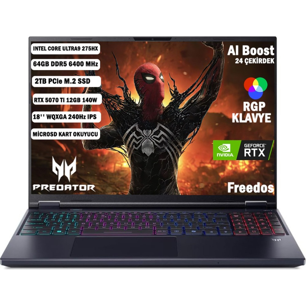ACER Predator PHN18-72 NH.QVMEY.00 RTX5070Ti WQXGA IPS 240Hz Intel® Core™ Ultra 9 275HX 64 GB RAM 2 TB SSD 18 inç FreeDOS Laptop Siyah