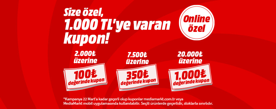 - Kampanya kapsamında 2.000 - 7.499,99 TL arasındaki alışverişlerinizde 100 TL, 7.500 - 19.999,99 TL arasındaki alışverişlerinizde 350 TL, 20.000 ve üzeri alışverişlerinizde 1.000 TL değerinde kupon uygulanacaktır.