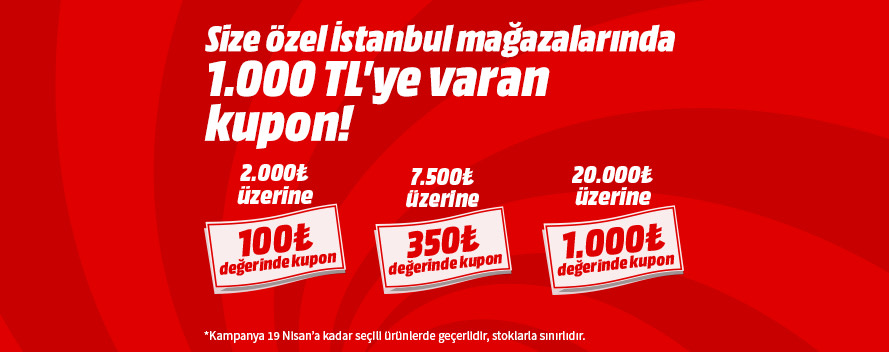 - Kampanya kapsamında 2.000 - 7.499,99 TL arasındaki alışverişlerinizde 100 TL, 7.500 - 19.999,99 TL arasındaki alışverişlerinizde 350 TL, 20.000 ve üzeri alışverişlerinizde 1.000 TL değerinde kupon uygulanacaktır.