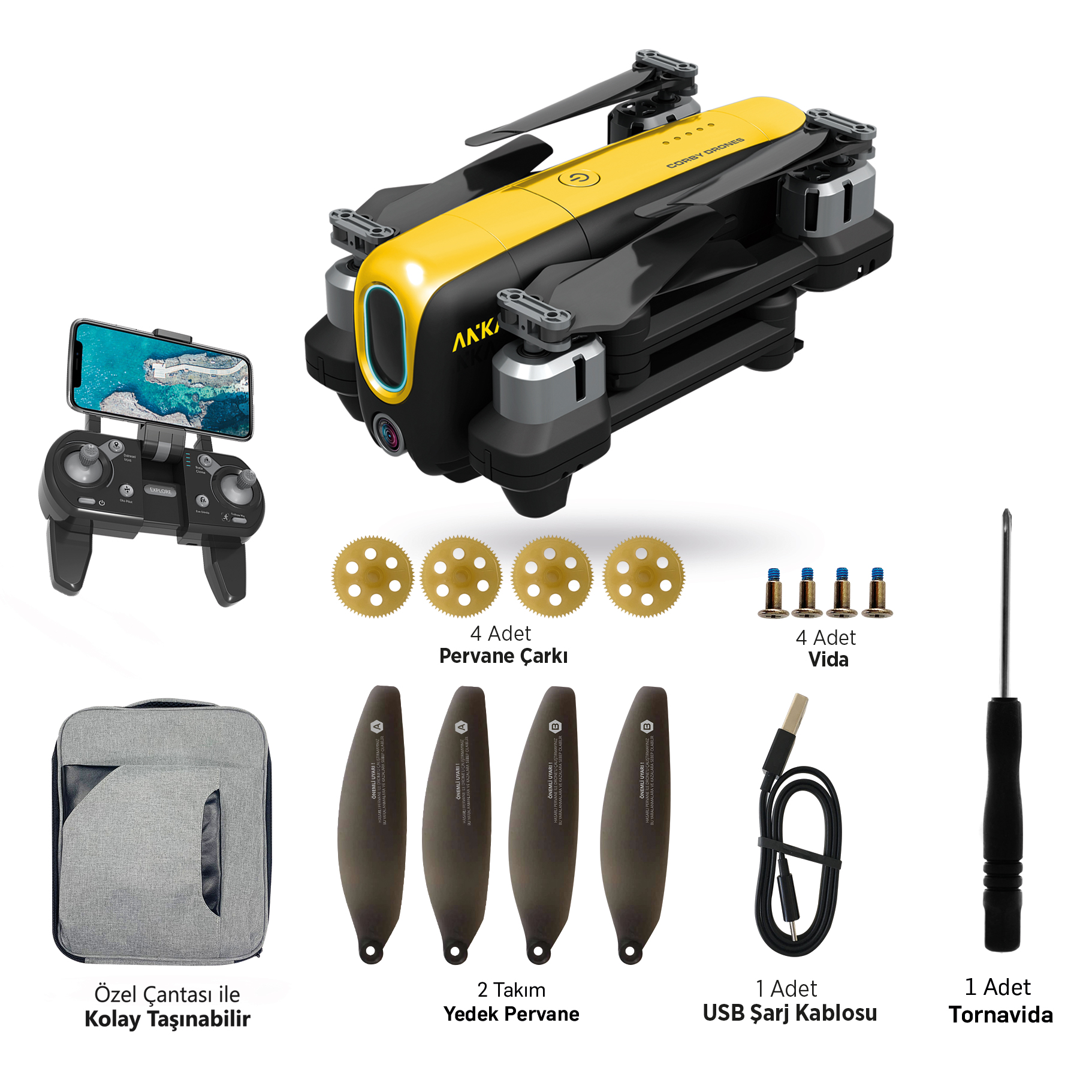 CX019 drone, kumanda, 2 takım yedek a kanadı, 2 takım yedek b kanadı, şarj kablosu, tornavida, taşıma çantası, kullanım kılavuzu