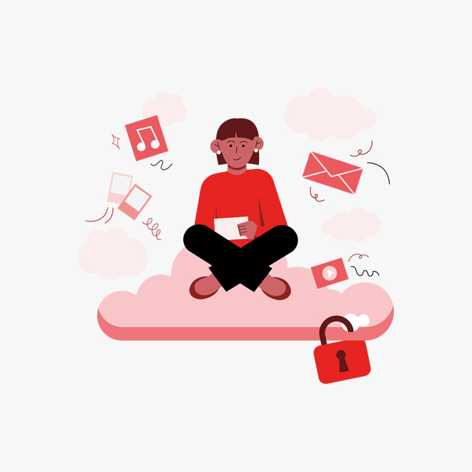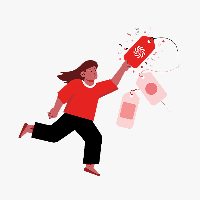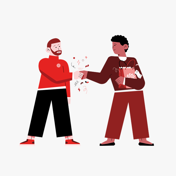 Kırmızı kazaklı kadın, beyaz zemin üzerinde büyük bir hediye kutusunu açıyor. Etrafta konfetiler var.