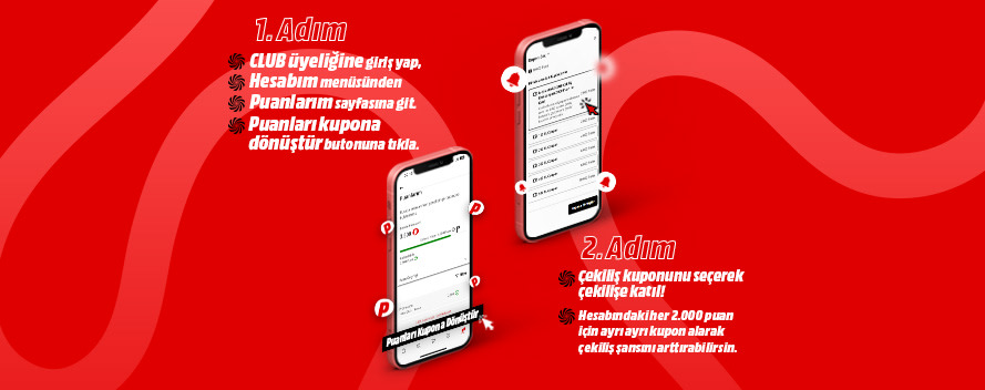 Web sitemizden ya da mobil uygulamamız üzerinden çekilişe katılabilmemiz için CLUB üyeliğinize giriş yaptıktan sonra, “Hesabım” menüsünden “Puanlarım” sayfasına gidip, “Puanları Kupona Dönüştür” butonuna tıkladıktan sonra çekiliş kuponunu seçerek çekilişe katılabilirsiniz. Hesabınızdaki her 2.000 puan için ayrı ayrı kupon alarak çekiliş şansınızı arttırabilirsiniz.
