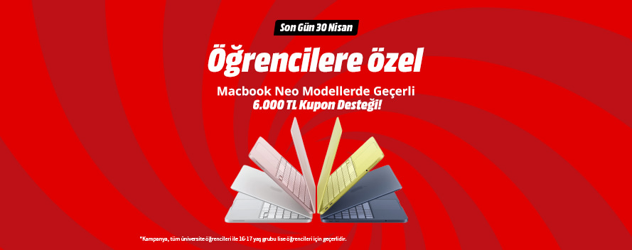 Kampanya, 25 Mart-30 Nisan 2026 tarihleri arasında MediaMarkt mağazalarından, web sitesinden adresinden ve MediaMarkt mobil uygulamasından, öğrenciler tarafından yapılacak alışverişlerde geçerlidir. Kampanya kapsamında öğrenciler tarafından yapılacak Macbook Neo ve M5 işlemcili modellerinde geçerli 6.000 TL kupon desteği uygulanacaktır. Kampanyadan yararlanılabilmesi için Bi'öğrenci'de öğrenciliğin doğrulanması ve buradan temin edilen kupon kodunun alışveriş esnasında kullanılması gerekmektedir. İş bu kampanya süresince, her bir müşteri kampanyadan bir (1) defa yararlanabilir. Koddan yararlanabilmek için MediaMarkt CLUB üyeliği zorunludur. Kampanya, tüm üniversite öğrencileri ile 16-17 yaş grubu arasındaki lise öğrencileri için geçerlidir. Bu kampanya kapsamında sağlanan avantajlar MediaMarkt Türkiye tarafından yapılan diğer kampanyalarla birleştirilemez, kazanılan kupon üçüncü kişilere devredilemez. MediaMarkt kampanya koşullarını değiştirme hakkını saklı tutmaktadır. Kampanya MediaMarkt tarafından satılan ürünlerde geçerli olup pazaryeri satıcılarından yapılacak alımlarda geçerli değildir. MediaMarkt kampanya koşullarını değiştirme hakkını saklı tutar.